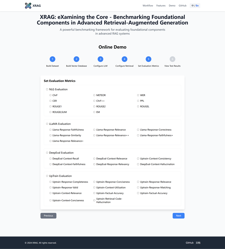 具体来说,XRAG支持全面的RAG测评Benchmark与Toolkit,涵盖了50+以上的测试指标与RAG的全面评测与失败点优化,支持4类Advanced RAG模块( 查询重构, 先进检索, 问答模型, 后处理) 的对比, 并集成模块内的多种具体实现,支持OpenAI大模型 API。XRAG1.0版本还提供了简单的Web UI Demo、轻交互的数据上传与统一标准格式, 集成了 RAG失败点检测与优化方法。