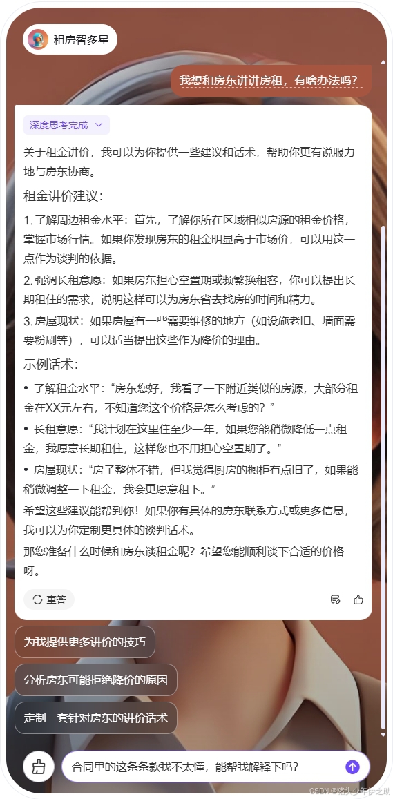“租房智多星”,“租房” 直接点明了其主要服务的领域,就是围绕房屋租赁相关事务展开。“智” 突出了它依靠 DeepSeek 模型强大的分析推理能力,能够智慧地处理诸如解读合同条款、辨别中介话术真假、提供房租讲价策略等各类租房中遇到的难题,凭借智能给出精准有效的解决方案。“多星” 则寓意着它像拥有很多闪光点、具备多种出色能力的明星一样,在租房这件事上可以从多个方面为用户提供高水准、全方位的贴心服务与得力帮助,是用户租房过程中的得力伙伴