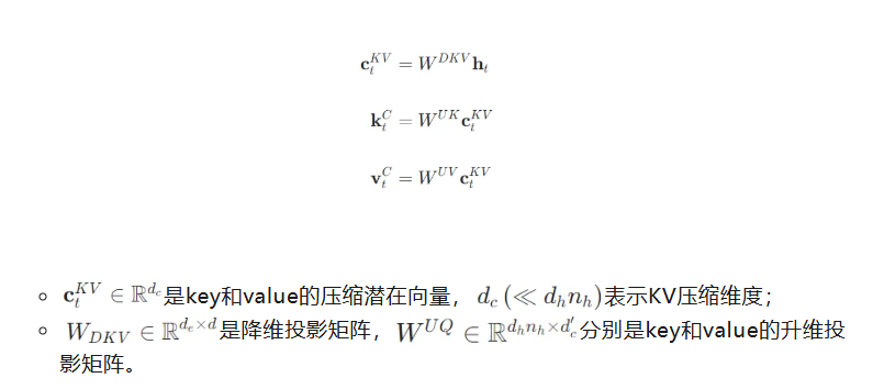 MLA模型通过低秩压缩对键(keys)和值(values)进行联合压缩,以减少KV缓存的大小。其核心公式为: