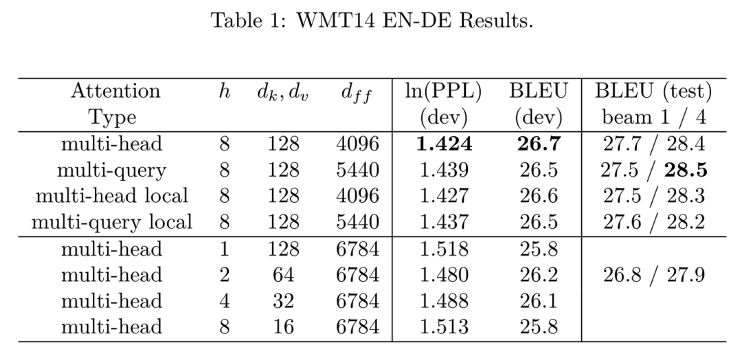 下图是论文中MHA和MQA的对比结果,可以看到由于共享了多个头的参数,限制了模型的表达能力,MQA虽然能好地支持推理加速,但是在效果上略比MHA差一点,但相比其他修改hidden size或者head num的做法效果都好。