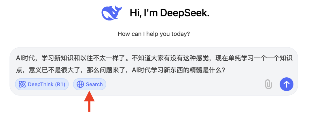 学习知识背后的逻辑、原理和方法论,是更重要的,咱们可以通过AI验证下。首先,进入DeepSeek-R1,要搜索其他博主观点,所以这里勾选Search(搜索)功能,查询提示词如下所示: