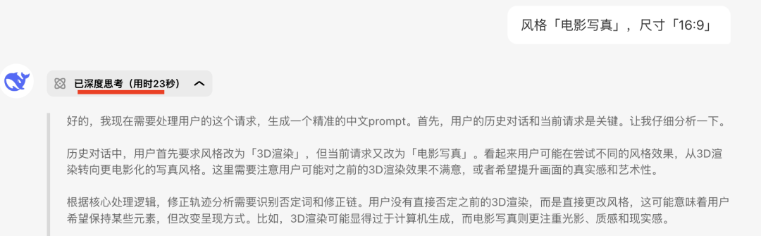 然后叫DeepSeek-R1思考并生图,一共思考了23秒: