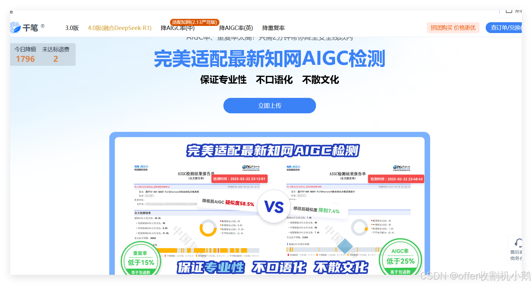 功能优势:有专门的 AIGC 降重功能,“移除 AI 痕迹”可调整词汇和文风,让 AI 生成内容难以被查重系统识破。上传 论文原文,系统自动识别并处理可能被识别为 AI 生成的内容,使文章更好通过各种查重平台检测,降痕结果支持知网、维普、万方等权威查重平台检测。