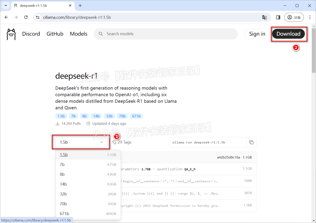 根据本机电脑配置(例如:1.5b)选择模型,点击右上角【Download】。
