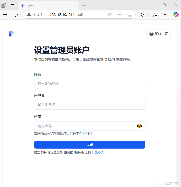 1:浏览器打开dify,初始化管理员信息(有时候会卡在加载的页面,刷新一下就好)