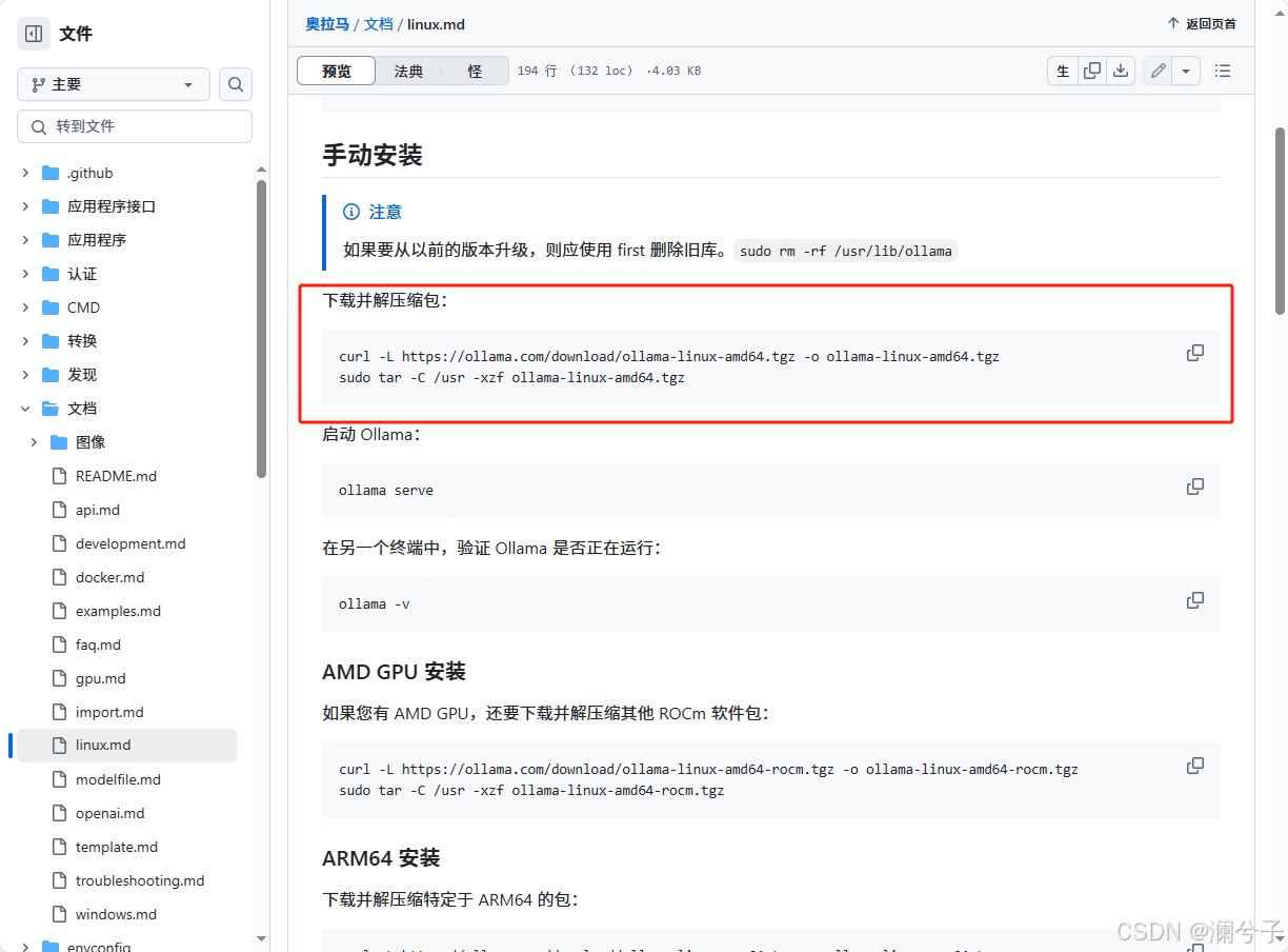 本实验搭载环境需要 docker的环境 Dify.zip社区版的安装包 以及从www.ollama.com官网 获取到 ollama-linux-amd64.tgz的压缩包 也可以从官网的手动安装说明里获取 里面教程更详细 只不过里面的步骤太慢了 这是之前做的时候 提前下载好的