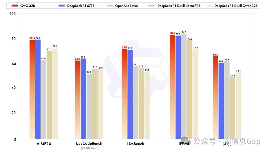 具体看下图,红色柱是 QwQ-32B 的分数,蓝色柱是满血版 DeepSeek-R1 的得分。
