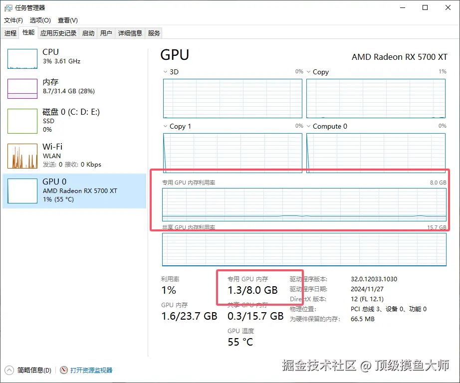 再次查看性能,如果专用显存占用有提升,说明DeepSeek已经在显卡中运行。