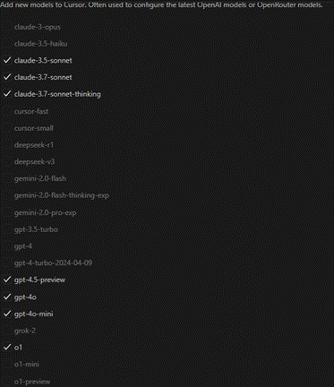 Cursor爆火原因之一就是内置了许多功能强大的AI模型,诸如claude、GPT-4和Deepseek等,这里我们可以根据具体需要选取合适的模型。