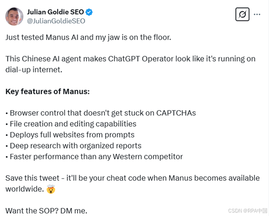 研究AI SEO的Julian Goldie专门发布了一个测试视频并表示,Manus功能强的让我目瞪口呆,具备浏览器控制、文件创建/编辑、自动生成完整网站,并且不会卡验证码。