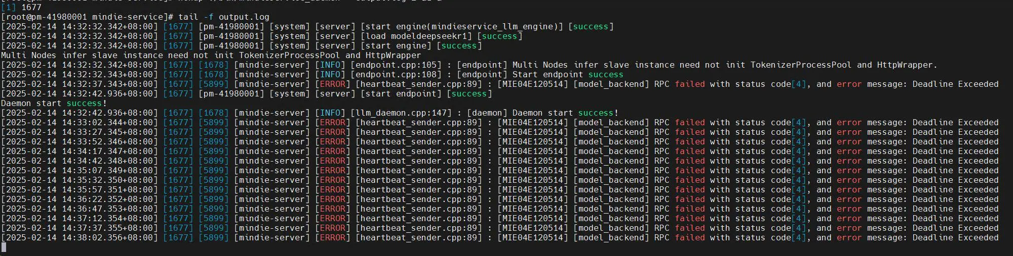 - 4 机推理,deepseek r1 服务化拉起失败,salve3 台服务化都能起,master 起服务会失败,报错信息如下图: