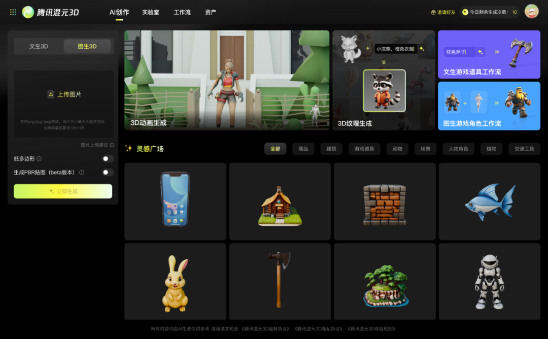 优势:由腾讯开源,产品完整度极高,包含低多边形、绑骨骼、草图生3D、工作流等功能;