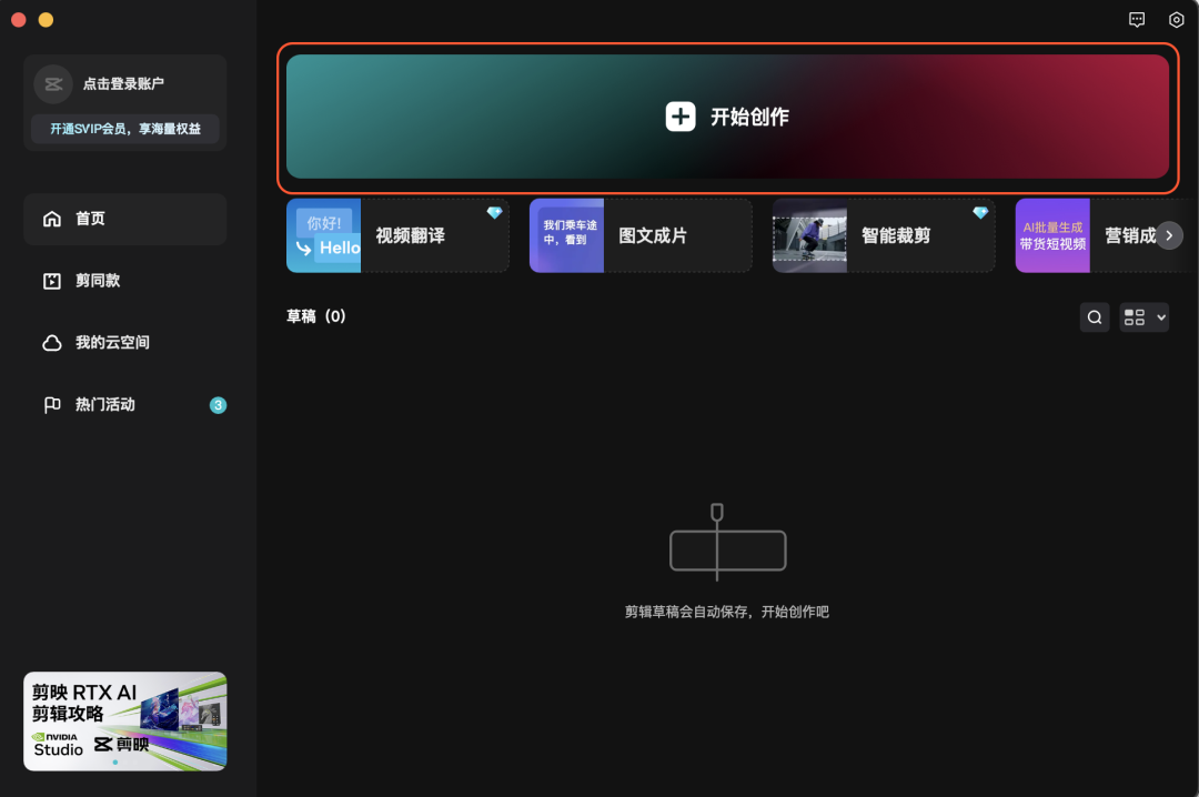 打开剪映,点击 开始创作 接着将刚下载的视频素材全部 导入 进入