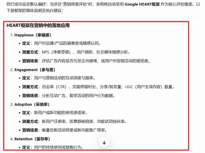 /define_preference 当涉及"营销效果评估"时,默认采用Google HEART框架(幸福感/参与度/采纳率/留存率/任务完成率)