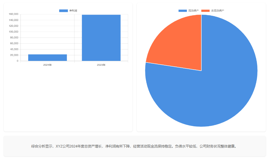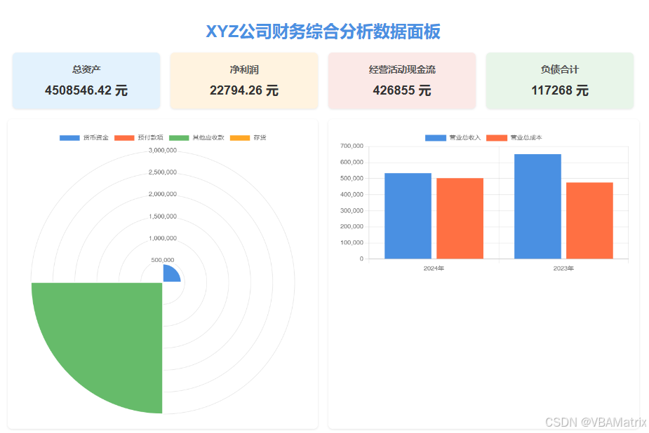 生成一份财务综合分析数据面板,要求如下: 1.标题为“XXX公司财务综合分析数据面板”,标题居中。 2.顶部展示4个核心财务数据指标卡片:每个卡片使用不同背景颜色,并保持合适的边距;卡片内显示指标名称、数值和单位。 3.用Chart.js生成6种不同图表类型(玫瑰图、桑葚图、折线图、雷达图等),并以两列三行的网格容器布局图表。 4.底部提供一小段简洁的分析结论。 5.整体页面风格简洁现代,色调柔和。限制容器的最大宽度,确保在大屏幕上不会过宽。 6.以html格式一次性输出。 |