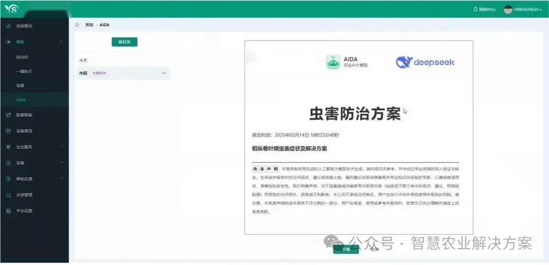 接入DeepSeek大模型,利用多年积累的农业行业知识库,搭建智慧农业专属大模型,以“AI+农业”为核心,推出覆盖农作物全生命周期的智能化解决方案。通过深度融合物联网、人工智能与农业科学,助力农场主、农业企业实现精准种植、高效管理、绿色防控,让每一寸土地都释放出最大的生产潜力。
