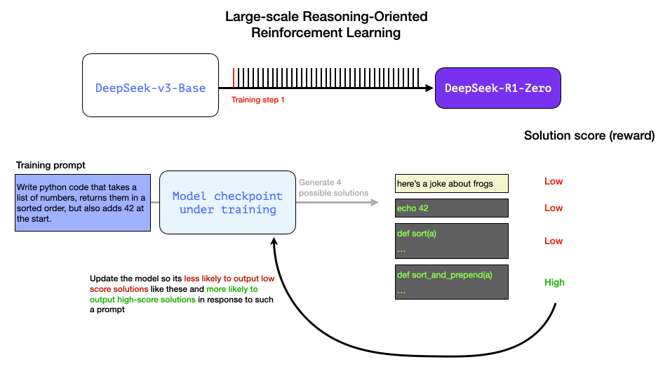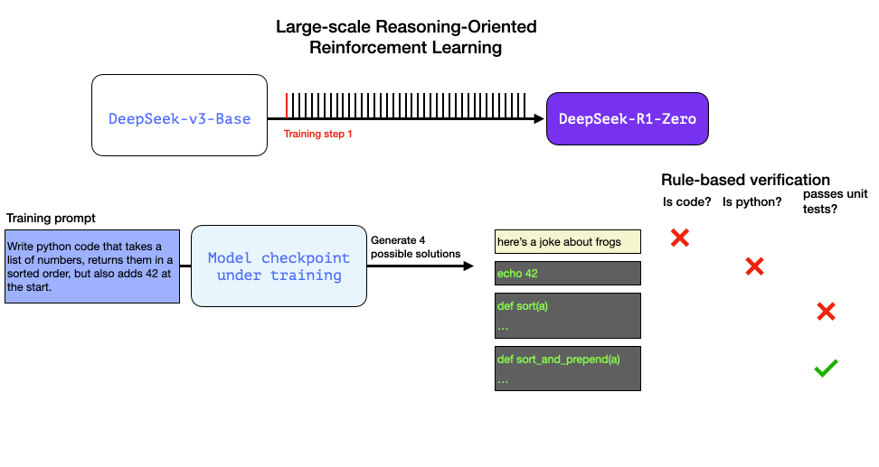 R1-Zero 的特殊之处在于,它无需使用带标签的监督式微调(SFT)训练集,就能在推理任务中表现出色。其训练过程直接从预训练的基础模型开始,通过强化学习(RL)训练流程完成(跳过了 SFT 阶段)。它的表现如此优异,甚至可以与 o1 模型相媲美。