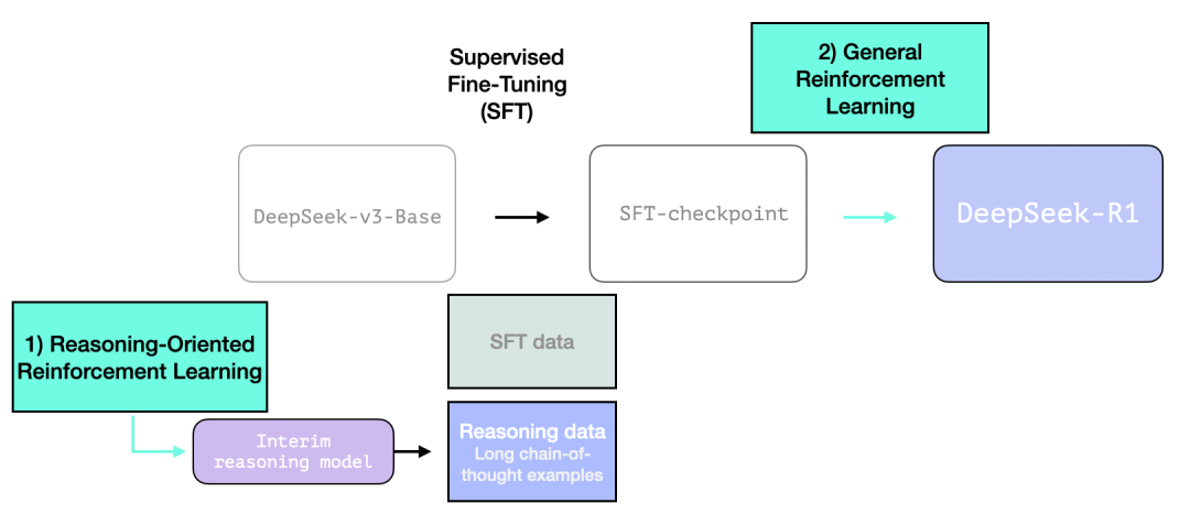 DeepSeek-R1 遵循以下总体流程:模型训练第一步的细节来自于之前 DeepSeek-V3 的论文。