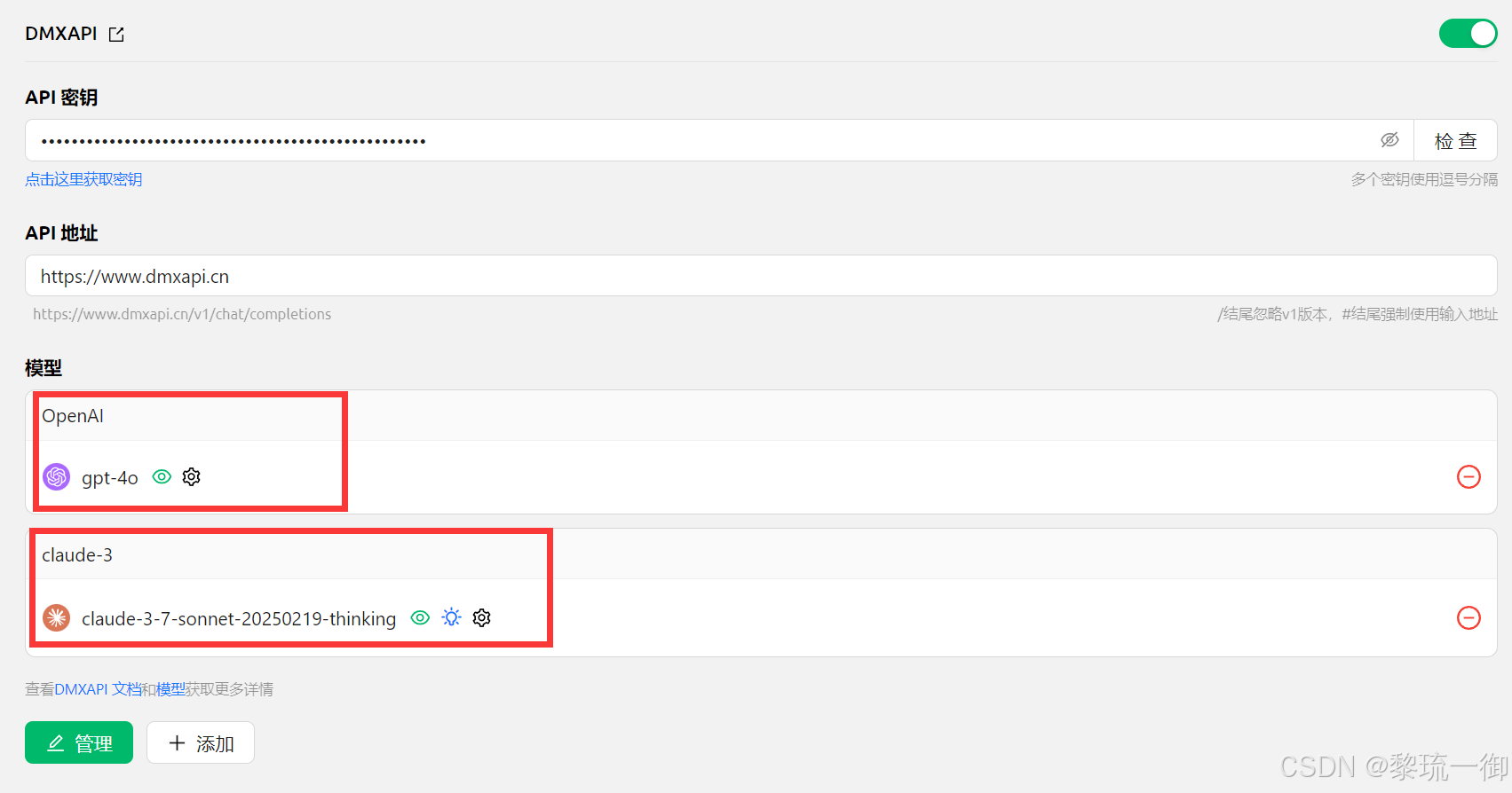 打开Cherry Studio,如图所示粘贴API密钥,在模型管理处添加所示模型: