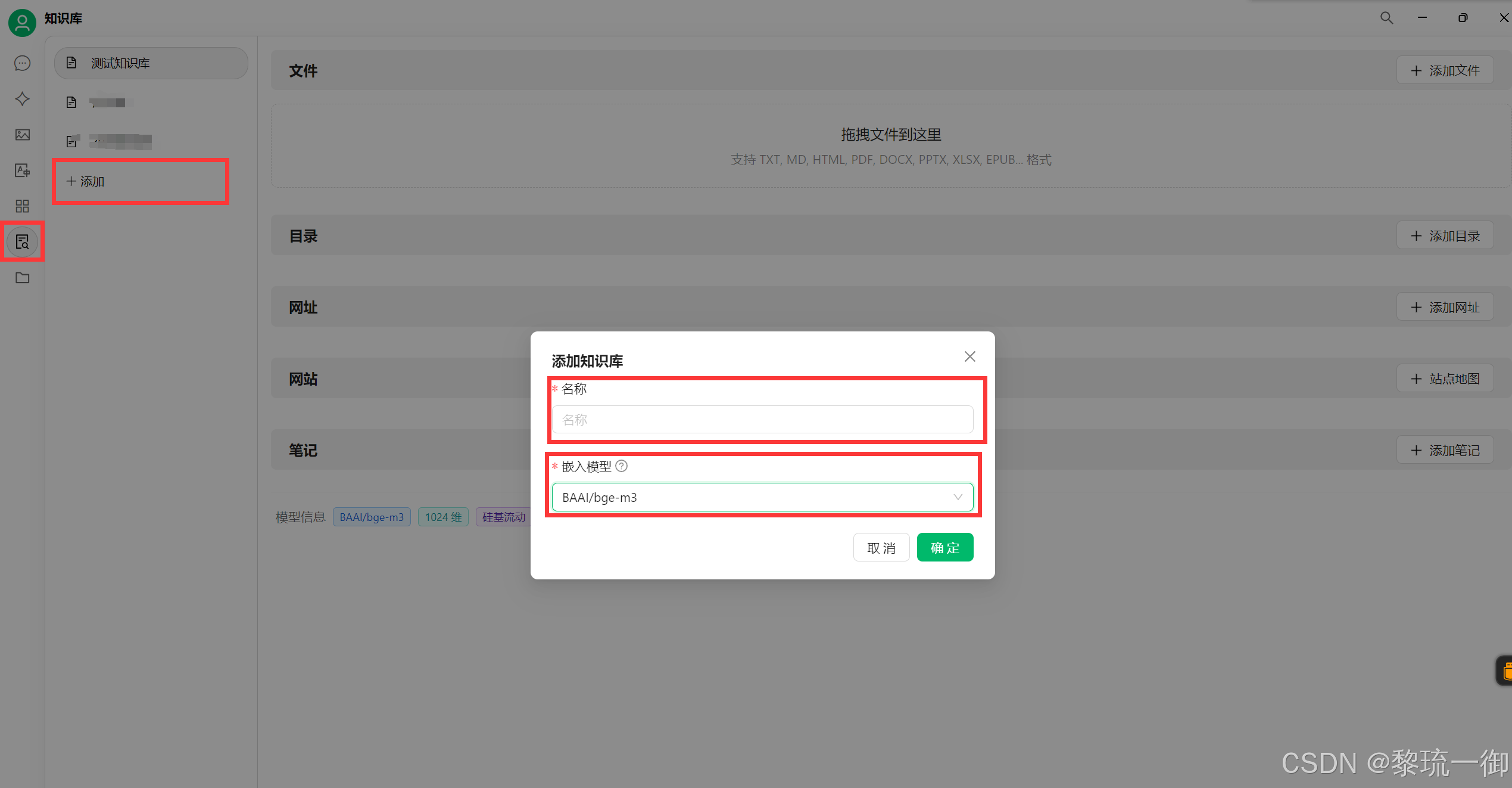 然后如下图使用BAAI/bge-m3嵌入模型,建立自己的知识库,知识库中可以上传文件(支持多种格式)、目录、网址、笔记,让AI更好的了解你的文件。