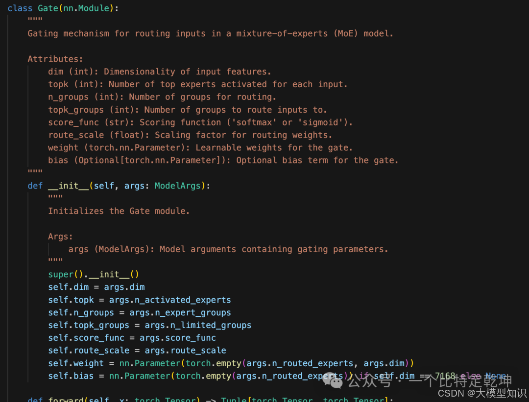 值得提一下的是,DeepSeek-V3 报告中的 “Auxiliary-Loss-Free Load Balancing” 的实现就跟这里 Gate 类定义的 self.bias 有关,在分数权重的后面加上了一个偏置 self.bias,通过这种方式来实现 “Auxiliary-Loss-Free Load Balancing” 。