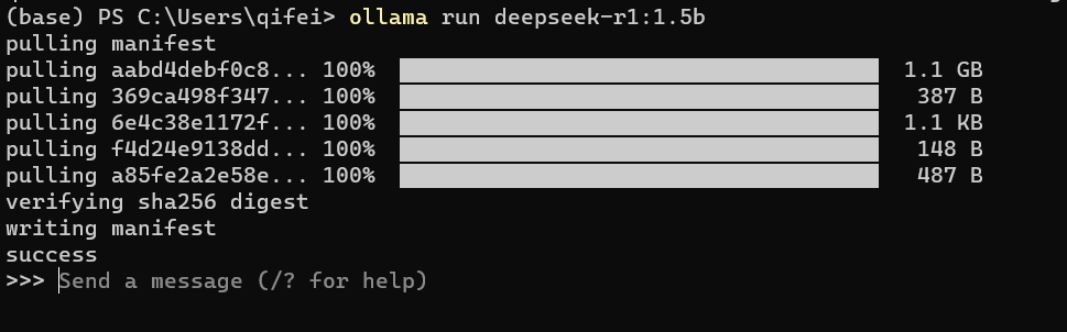 下载完成后,ollama会为我们运行刚下载的大模型。下面是我运行成功的截图: