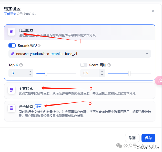 检索设置,我们可以设置向量检索、全文检索、混合检索