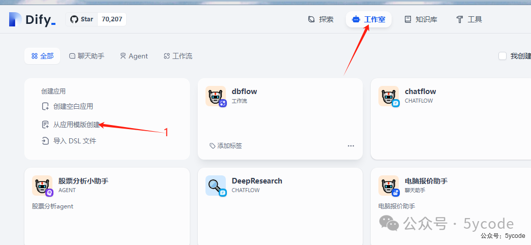 1工作室主要是当前工作空间下所有应用。2包含了聊天助手、Agent、工作流等。- 通过