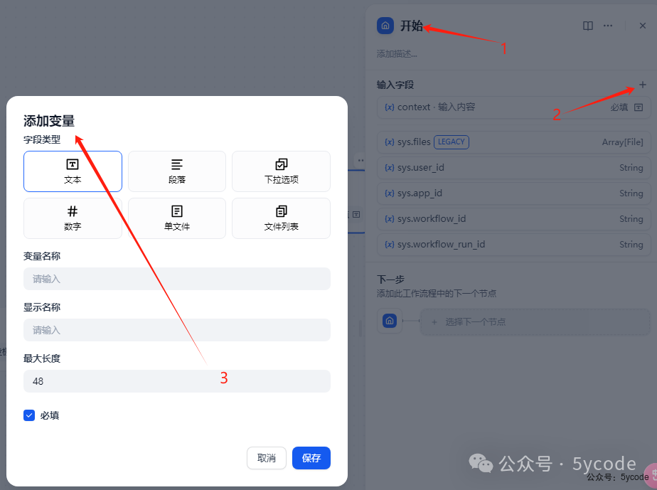 当我们需要用户传入一些特定的信息的时候,可以通过添加变量来实现,在开始节点对应1的位置添加。