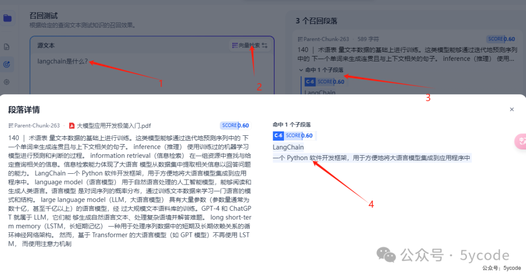 1我们输入测试问题2设置检索方式3我们可以看到匹配到的内容以及socre,点击查看详情4