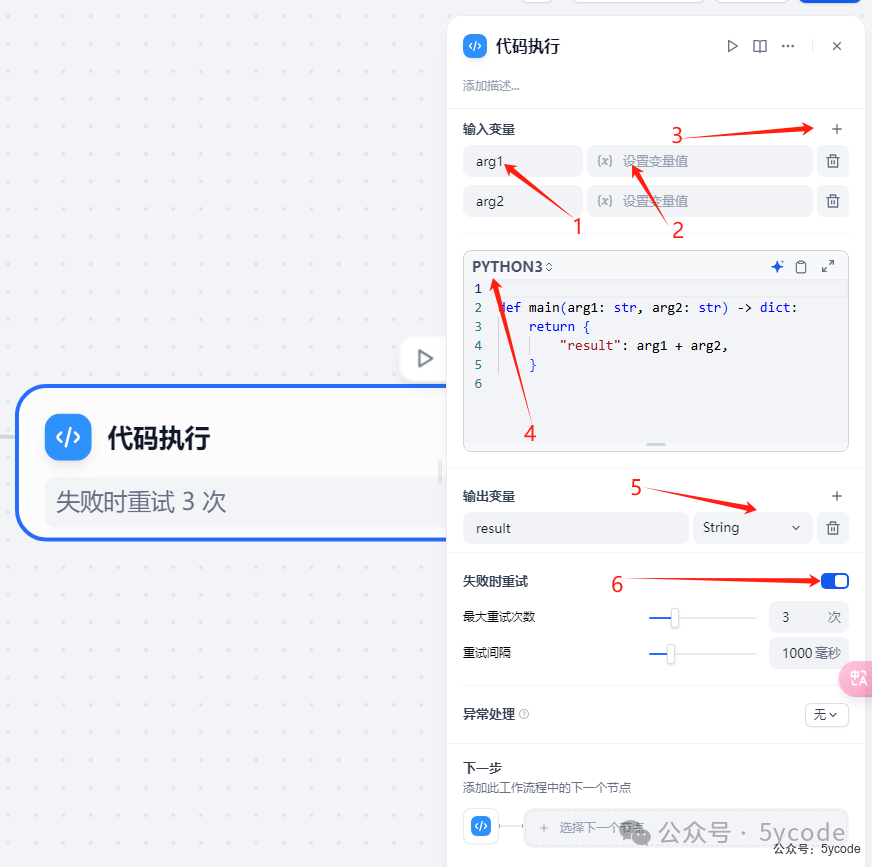 增加知识检索节点,并把开始节点的query设置到查询变量1里,点击2的位置添加知识库,通过3可以设置召回策略。
