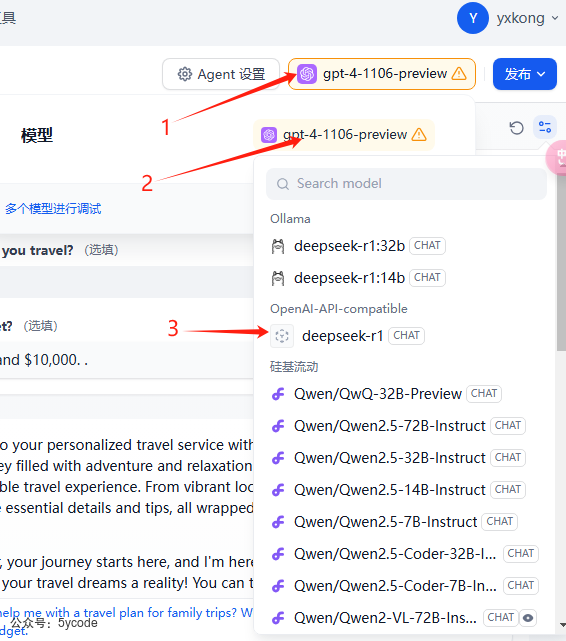 这里面有下面这些操作模型选择: 通过1可以选择使用哪个模型(模型供应商配置,参考前一篇)