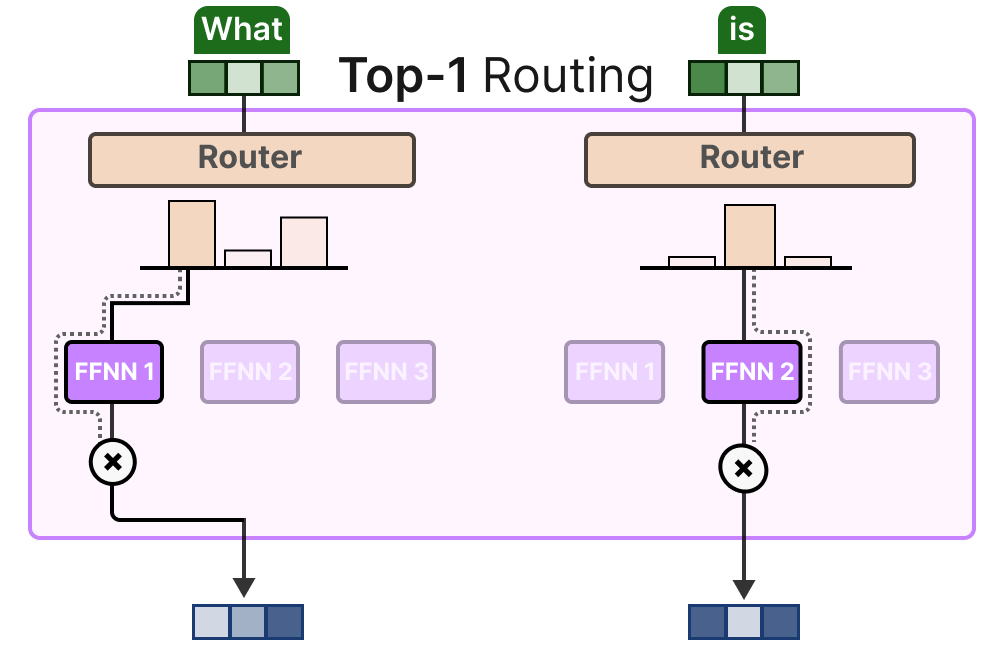 这种架构(Top-1 路由)假设每次路由只需要一个专家来学习如何路由输入。这与我们之前看到的有所不同,后者假设 token 应该路由到多个专家(Top-k 路由)来学习路由行为。