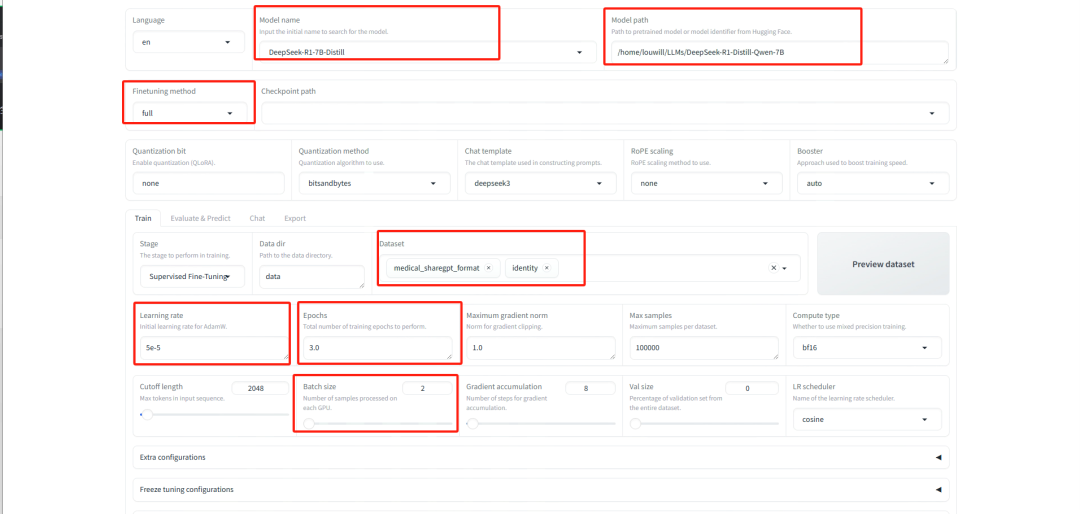 需要配置的选项已用红框圈出,包括:微调的模型名称、模型本地路径、微调方式(全参数还是lora)、数据集、学习率、训练轮数Epochs、批次大小等。