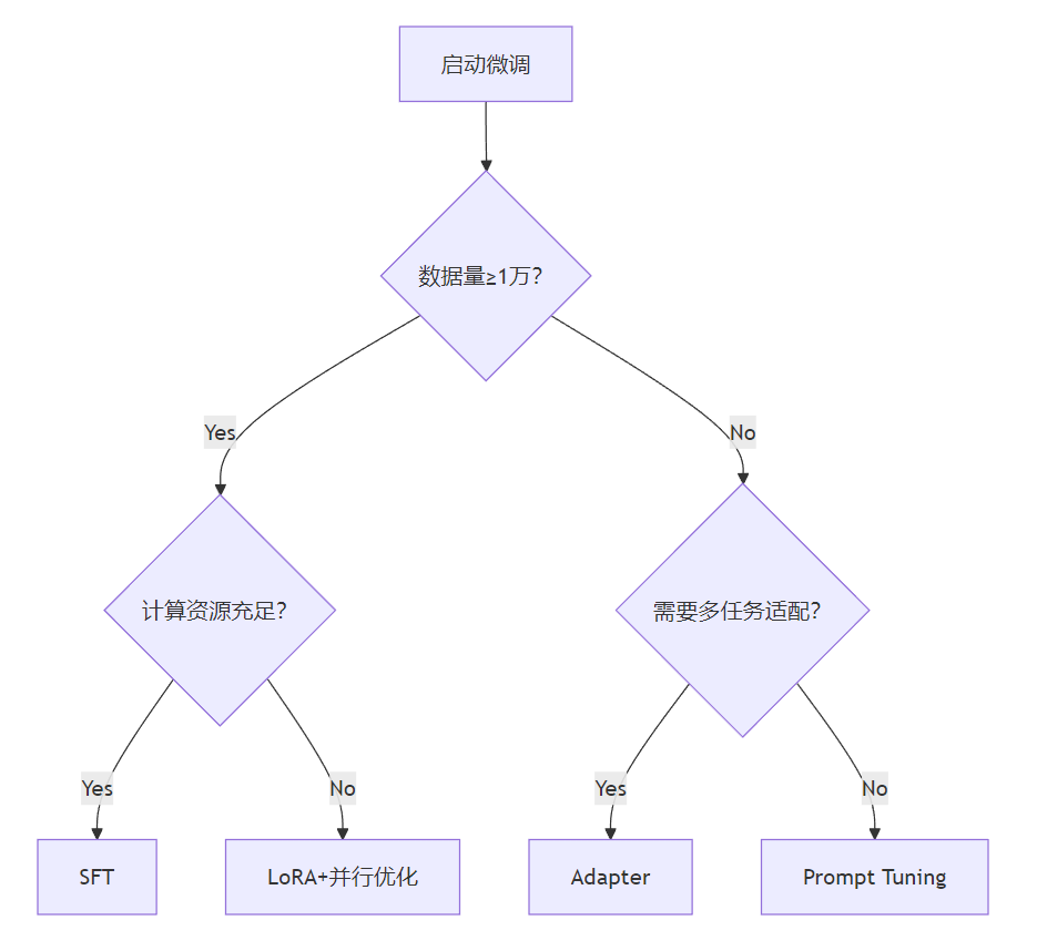 那么时候用全量微调,什么时候用LoRA呢?这取决于你手中的数据和算力资源评估,如下图所示。