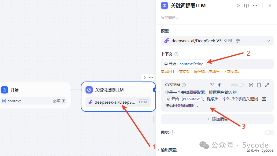 添加一个LLM,把开始节点设置的context字段作为上下文传入,并设置提示词提取关键词。