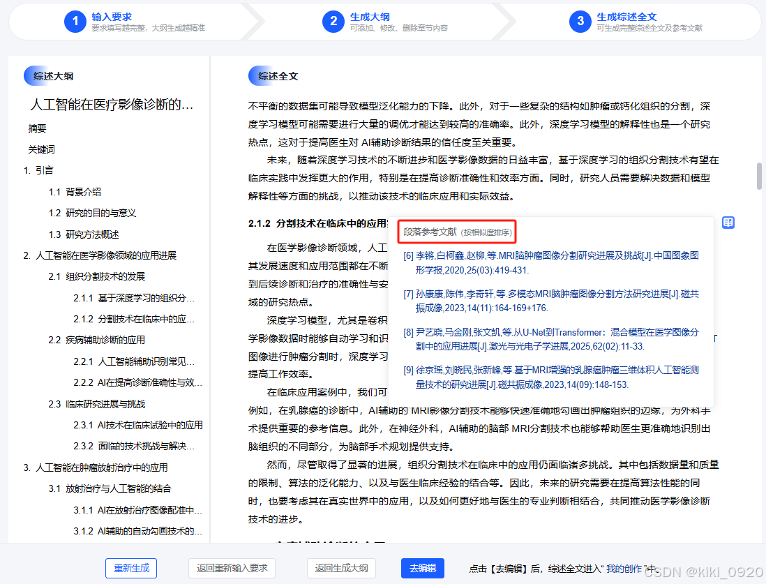 1. 点击“生成大纲”,系统会根据主题和参考文献自动生成综述框架(如“研究背景→技术分类→应用案例→挑战与展望”)。