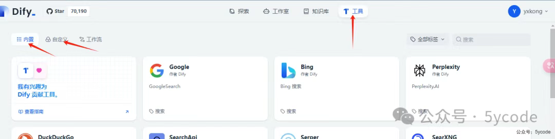 工具有dify内置的应用,也有三方工具,也可以自定义工具。