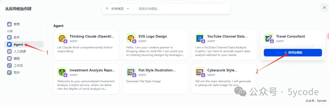 在这个模块里,dify给我们内置了一些应用模板,以降低我们的学习使用成本。按照分类已经帮我们罗列好了,我们可以点击对应的分类查询,看中哪个鼠标放上去,点击添加到工作区即可。
