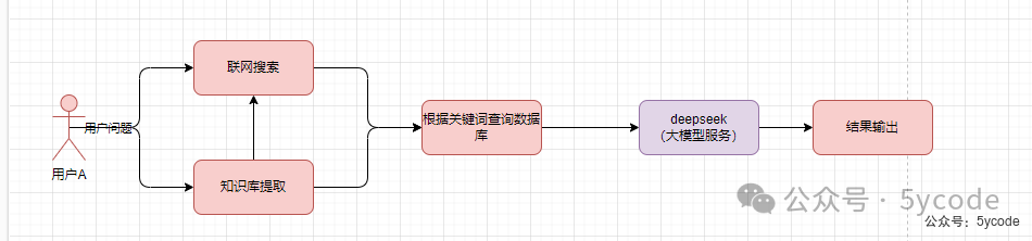 - 1,用户输入问题-> 大模型提炼关键词->然后查询数据库->将结果和问题给大模型->输出结果