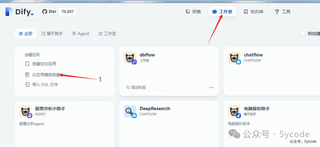 1工作室主要是当前工作空间下所有应用。2包含了聊天助手、Agent、工作流等。- 通过