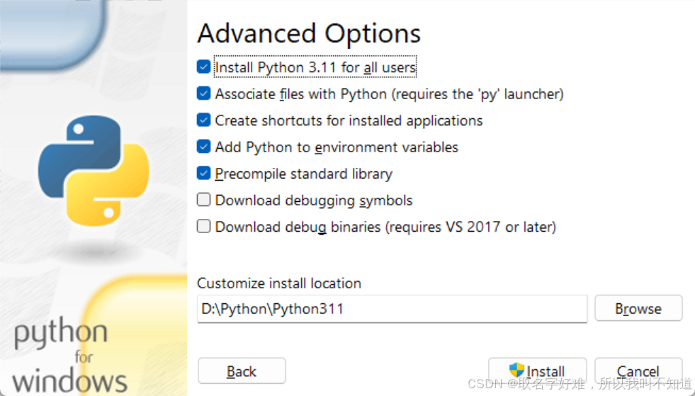 2.install Python 3.11 for all users 为所有windows账户都可用。