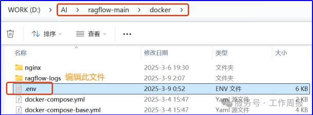 - 然后修改D:\AI\ragflow-main\docker.env配置文件。修改的目的是下载ragflow Docker的镜像:v0.17.1,而不是RAGFlow slim Docker镜像v0.17.1-slim。Slim版本没有embedding模型。