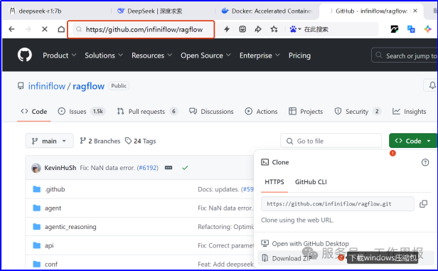 3.4.1. 下载RAGflow源代码地址:https://github.com/infiniflow/ragflow,点击code按钮,download zip。