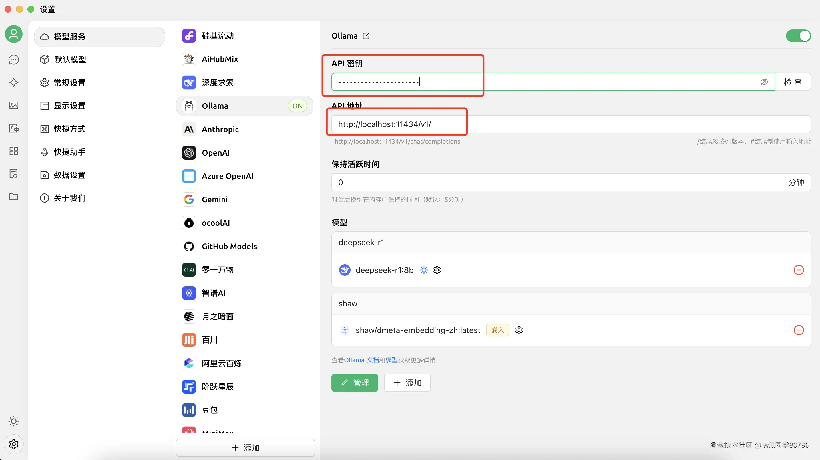 左下角设置 → 模型服务 → Ollama