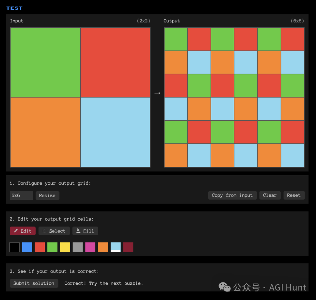 以下面这道图案变换题小试身手(https://arcprize.org/play?task=00576224):