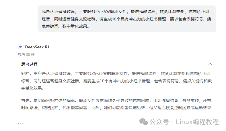 现在做小红书内容的朋友们都知道,这个平台已经成为流量密码的关键。但是,光靠努力可不够,还得有点“黑科技”加持。今天就来聊聊DeepSeek这个神器,如何帮你打造高转化的小红书内容矩阵,让你的账号爆单不断!大家都知道,标题就是门面,吸引用户点进去是关键。如果标题不够吸引人,再好的内容都没人看。传统的方法要不停调试各种Prompt,既麻烦又不稳定。举个例子,你是一名健身教练,主要服务25-35岁的职场