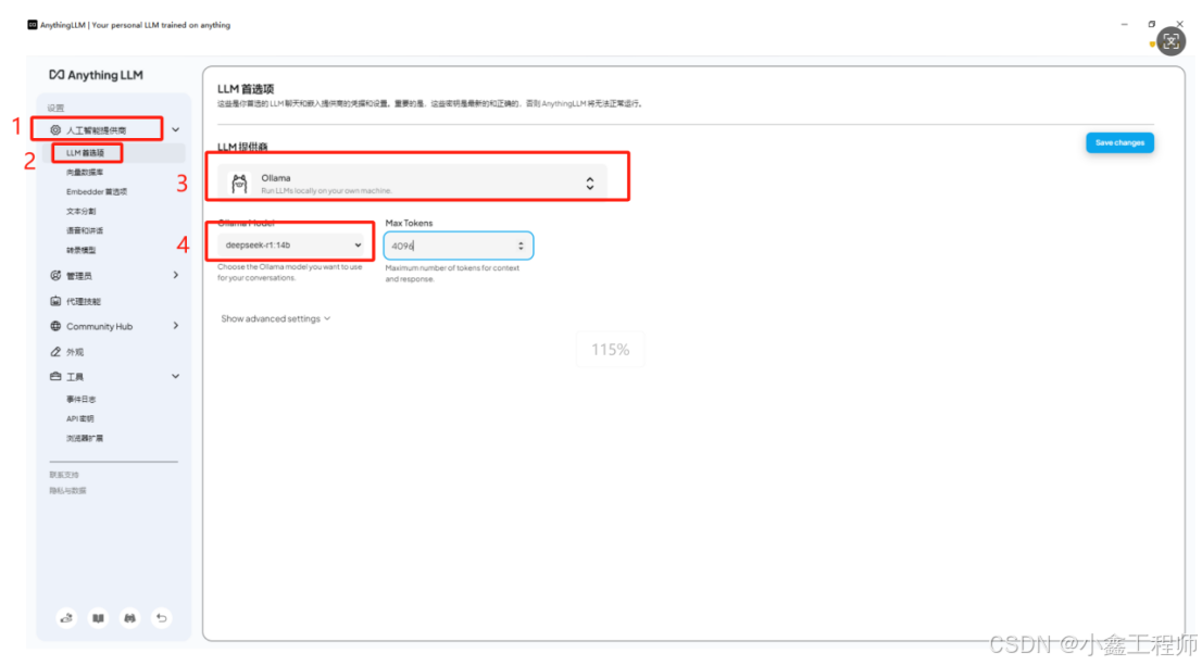 - ①点击【人工智能提供商后面的倒三角】,②点击【LLM首选项】,③提供商选择【Ollama】,④Ollama Model选择【deepseek模型】,⑤最后点击【Save changes】
