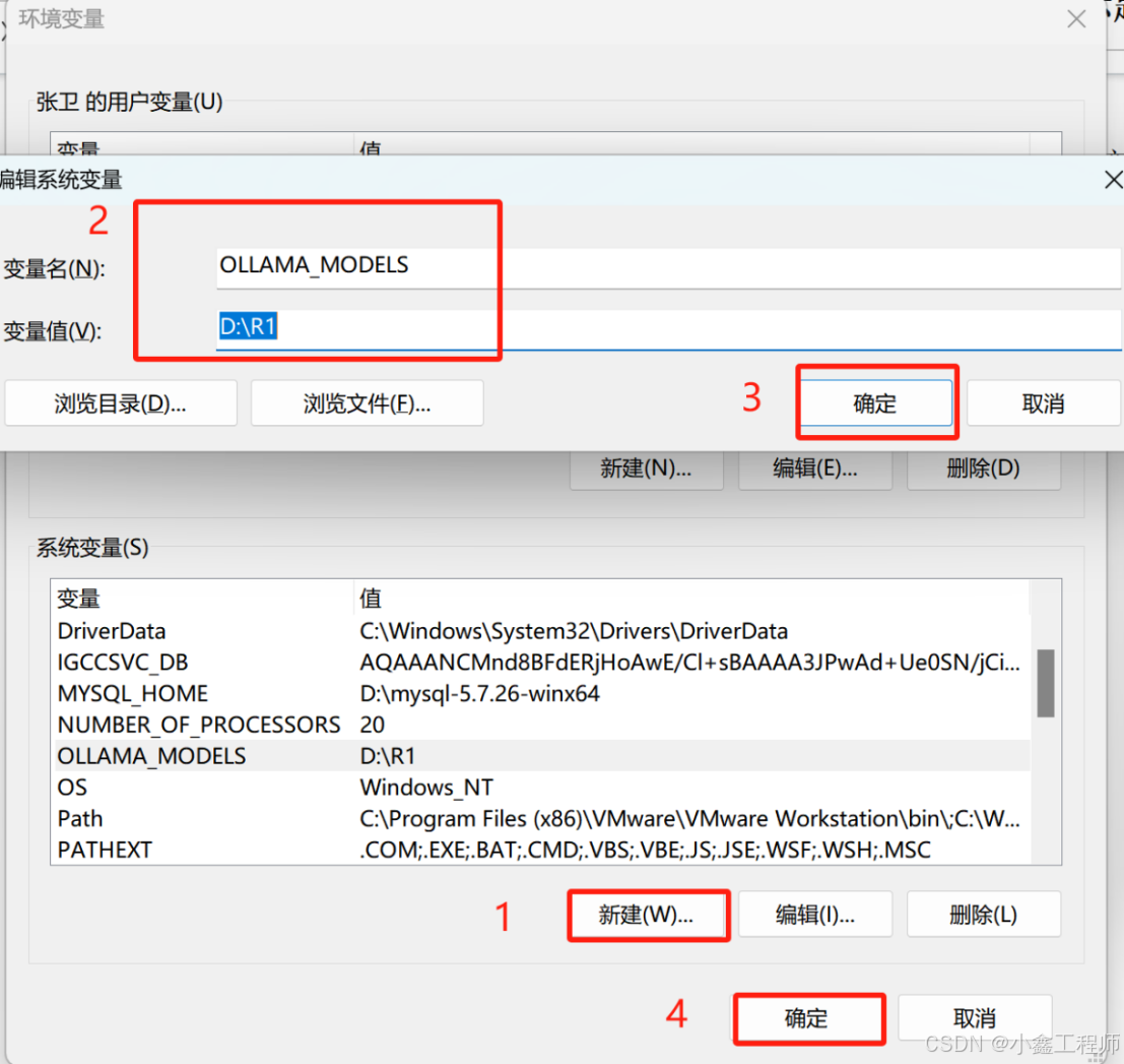 - ①在系统变量下点击【新建】;②变量名输入【OLLAMA_MODELS】,变量值输入【D:\R1】;③点击【确定】;④点击【确定】
