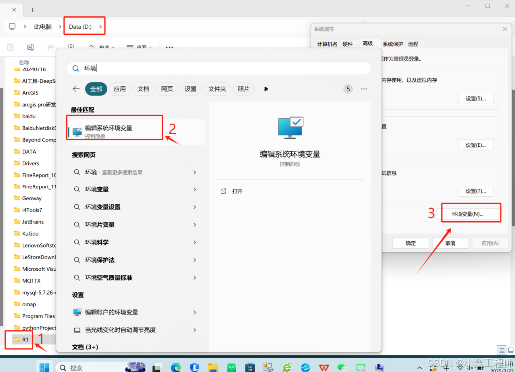 6、①在D盘新建一个文件夹命名为【R1】;②电脑开始菜单搜索【环境变量】,点击【打开】;③点击【环境变量】提示:6和7步骤是改变模型下载的路径,如果C盘空间大就不要操作。